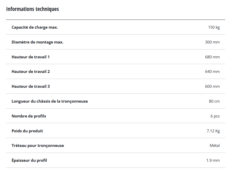 Le chevalet de sciage à chaîne Einhell offre une sécurité et une stabilité maximales lorsque vous travaillez avec une tronçonneuse. Les entretoises supplémentaires garantissent que le chevalet de sciage se tient solidement pendant l'exécution du travail. Le chevalet de sciage à chaîne est conçu pour une capacité de charge maximale de 150 kilogrammes et le chevalet de sciage a une longueur de 80 centimètres. Les troncs d'arbres d'un diamètre allant jusqu'à 300 millimètres peuvent être placés confortablement sur le chevalet de sciage à chaîne et sciés. Les dents empêchent le bois de se tordre lors du travail avec la scie. Les profilés d'angle robustes et galvanisés sont fabriqués en métal durable. Pour permettre un travail confortable et ergonomique, le chevalet de scie à chaîne peut être réglé sur trois hauteurs de travail différentes: à 680 mm, 640 mm et 600 mm. Il peut être replié et donc rangé dans un minimum d'espace dans la remise, le garage ou le sous-sol en un rien de temps jusqu'à ce qu'il soit à nouveau nécessaire.