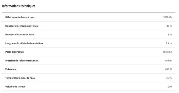 Le surpresseur GC-WW 6538 vous permet d'utiliser directement l'eau claire stockée dans des récupérateurs d'eau de pluie, citernes ou puits pour une utilisation dans les systèmes d'arrosage, les équipement de lavage, la chasse d'eau et bien plus encore. Grâce à son moteur 650W, le surpresseur offre un débit jusqu'à 3800 litres d'eau par heure. La cuve possède une capacité de 20 litres, ce qui permet de ne pas activer la pompe à chaque utilisation d'eau. Le système de contrôle de la pression permet une correction automatique de celle-ci en cas de perte de pression, et l'arrêt du surpresseur dès que la pression est revenue à la normale. De plus, la jauge vous permet de contrôler la pression en un coup d'oeil. Le large bouchon de remplissage permet un démarrage facile et rapide, et le bouchon de purge permet une évacuation simple d'éventuelles eaux résiduelles.
