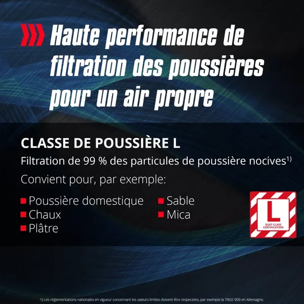 - Particules (VLEP > 1 mg/m³) et classe de filtration L (norme européenne)