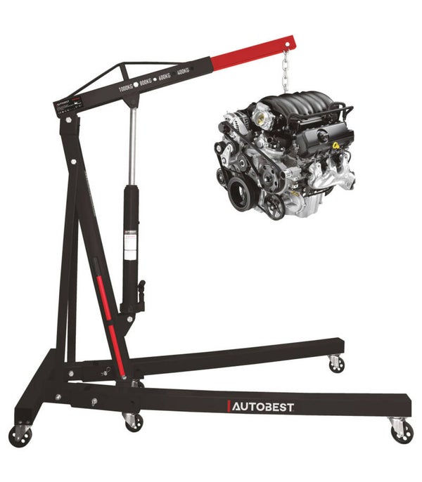 Puissante, cette grue d'atelier vous permettra de lever sans effort le moteur d'un véhicule ou une pièce lourde à manipuler.